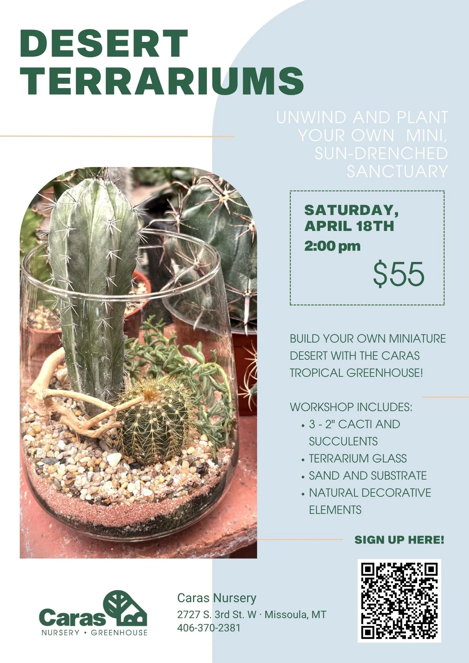 Workshop: Desert Terrariums Saturday, April 18, 2026 2:00 PM 3:00 PM Caras Nursery 2727 South 3rd Street West Missoula, MT, 59804 United States (map) Google Calendar ICS SIGN UP HERE!
