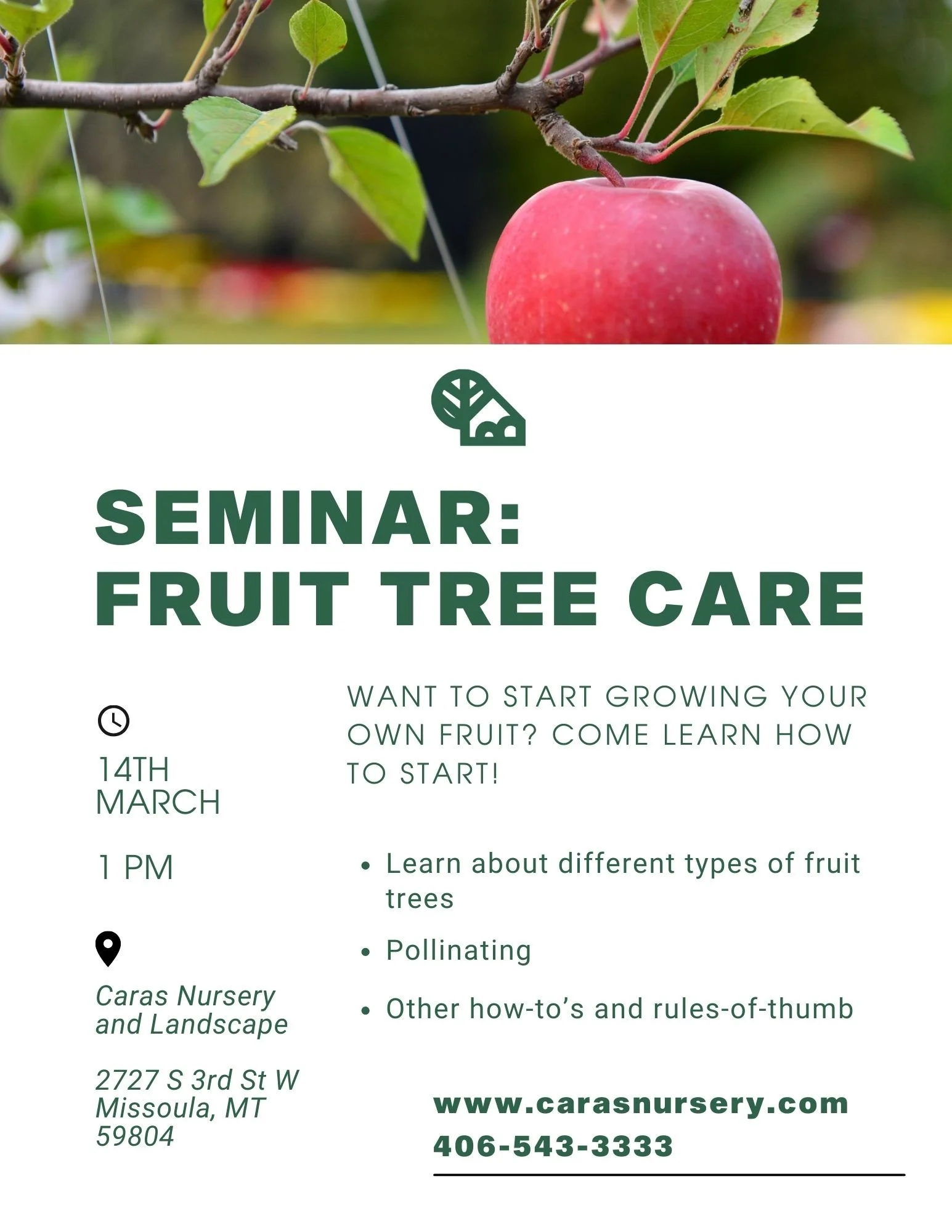 Back to All Events Seminar: Fruit Tree Care Saturday, March 14, 2026 1:00 PM 2:00 PM Caras Nursery 2727 South 3rd Street West Missoula, MT, 59804 United States (map) Google Calendar ICS