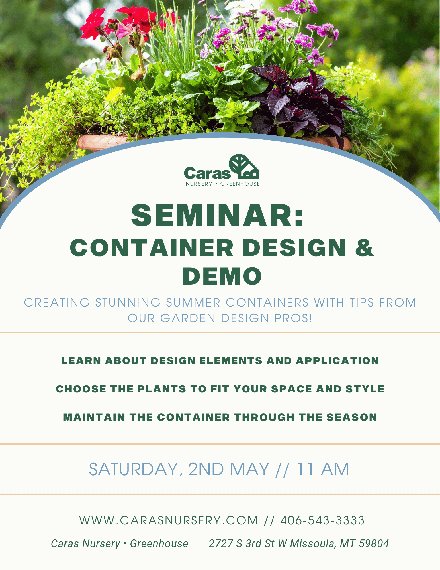 Back to All Events Seminar: Container Design & Demo Saturday, May 2, 2026 11:00 AM 12:00 PM Caras Nursery 2727 South 3rd Street West Missoula, MT, 59804 United States (map) Google Calendar ICS