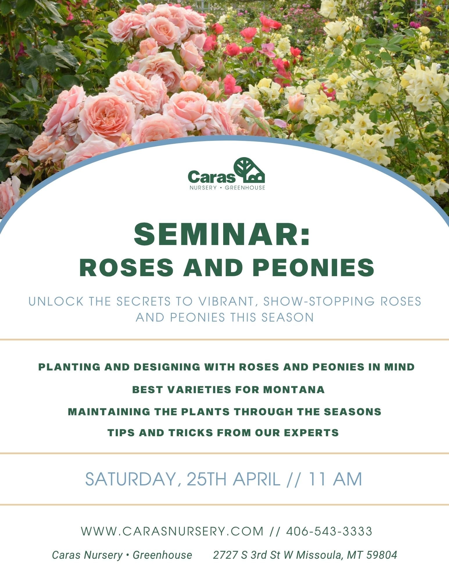Seminar: Roses & Peonies Saturday, April 25, 2026 11:00 AM 12:00 PM Caras Nursery 2727 South 3rd Street West Missoula, MT, 59804 United States (map) Google Calendar ICS