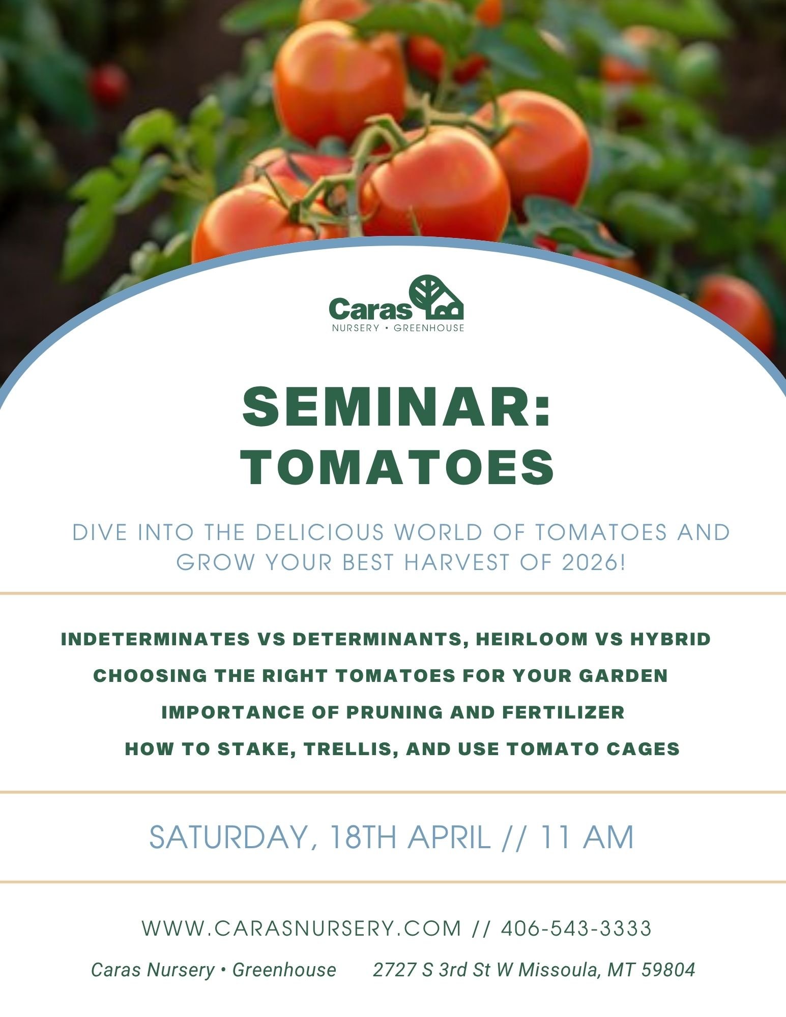 Seminar: Tomatoes Saturday, April 18, 2026 11:00 AM 12:00 PM Caras Nursery 2727 South 3rd Street West Missoula, MT, 59804 United States (map) Google Calendar ICS